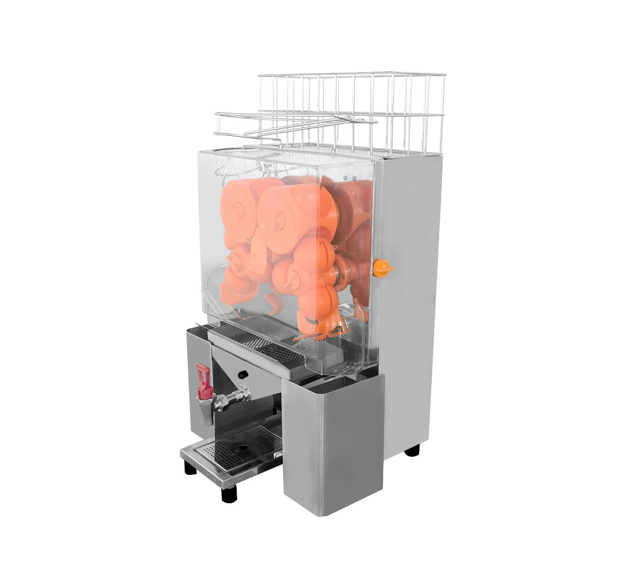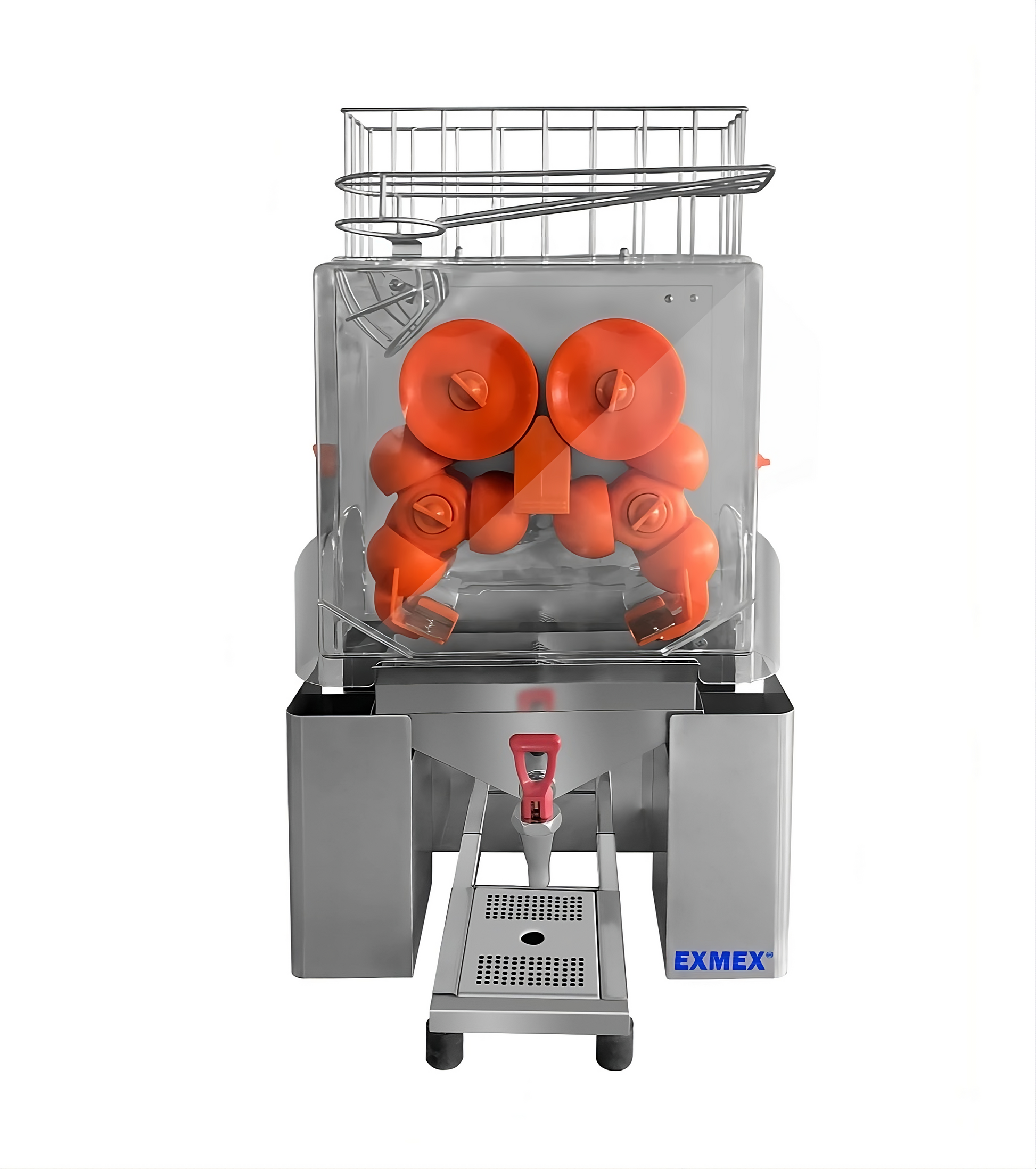 La máquina Automatic juice plus es una opción superior en el mercado gracias a su diseño único y moderno. Con un 100% de eficiencia en el exprimido de naranjas, obtiene más jugo que otros equipos similares. Experimente una mayor productividad y resultados superiores con el Exprimidor de naranjas automático Exmex.